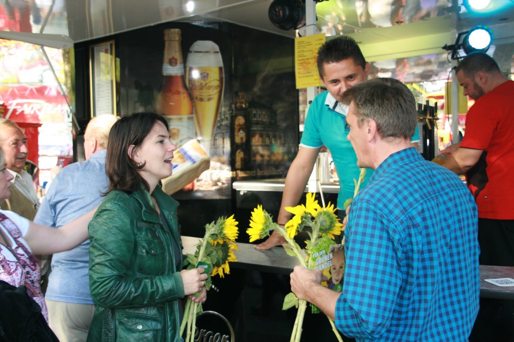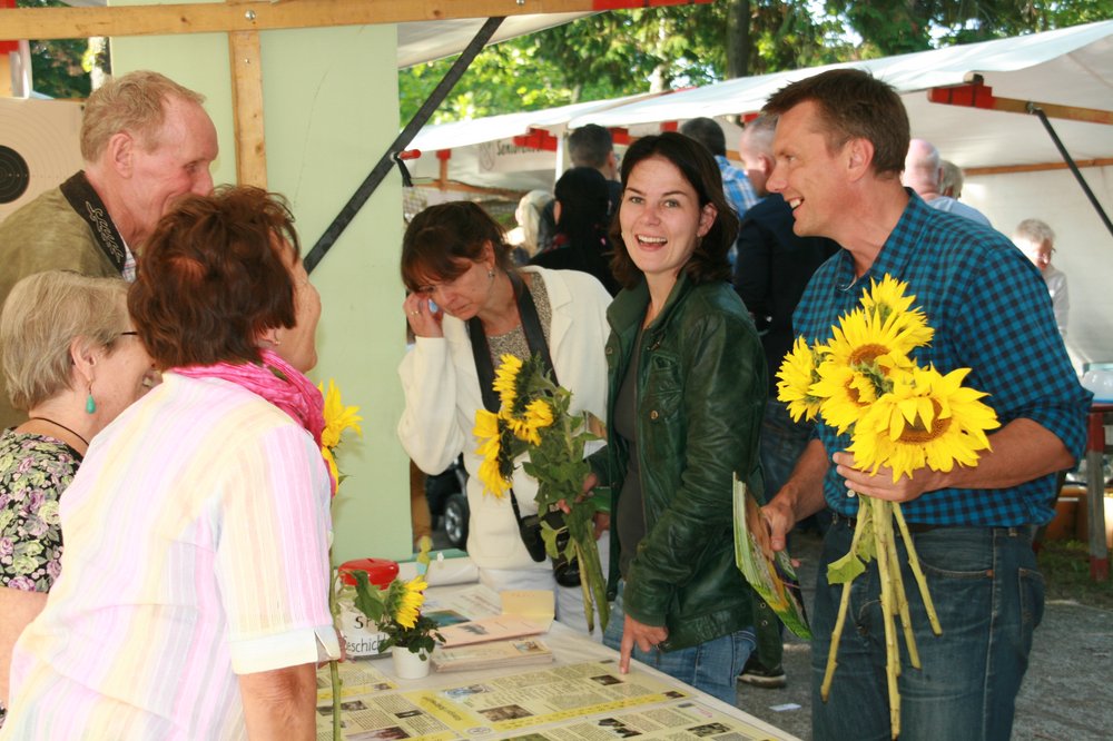 Am Nachmittag hat sich unsere Bundestagskandidatin dazu gesellt und Sonnenblumen an die vorbeiströmenden Menschen verteilt.