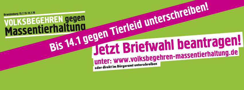 Jede Brandenburgerin und jeder Brandenburger hat noch bis zum 14. Januar Zeit, seine Stimme für das Volksbegehren abzugeben. Die Eintragungslisten liegen in allen Bürgerämtern aus und die Briefwahlunterlagen können unter www.volksbegehren-massentierhaltung.de angefordert werden.