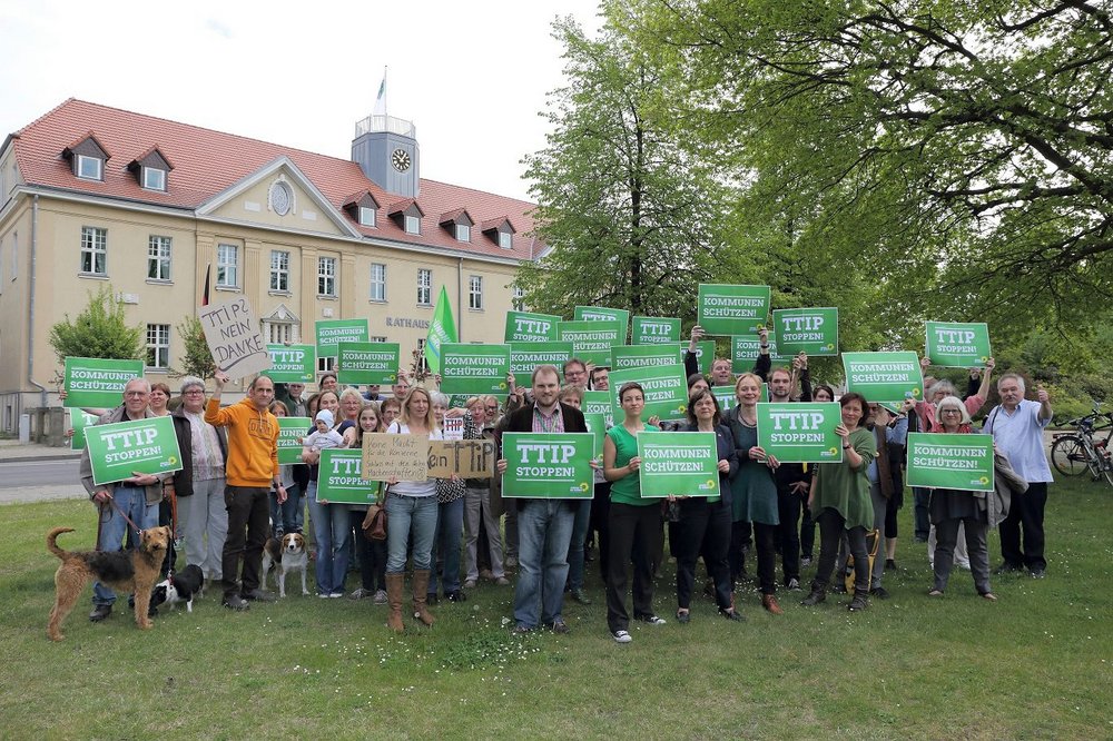 Vor Beginn des Parteitags wiesen die Bündnisgrünen in einer bunten Aktion zum Europatag vor dem Falkenseer Rathaus auf die Risiken des Freihandelsabkommens TTIP für die kommunale Eigenständigkeit hin. Ein entsprechender Antrag wurde einstimmig beschlossen. Er sieht vor, TTIP in seiner jetzigen Form zu verhindern.
