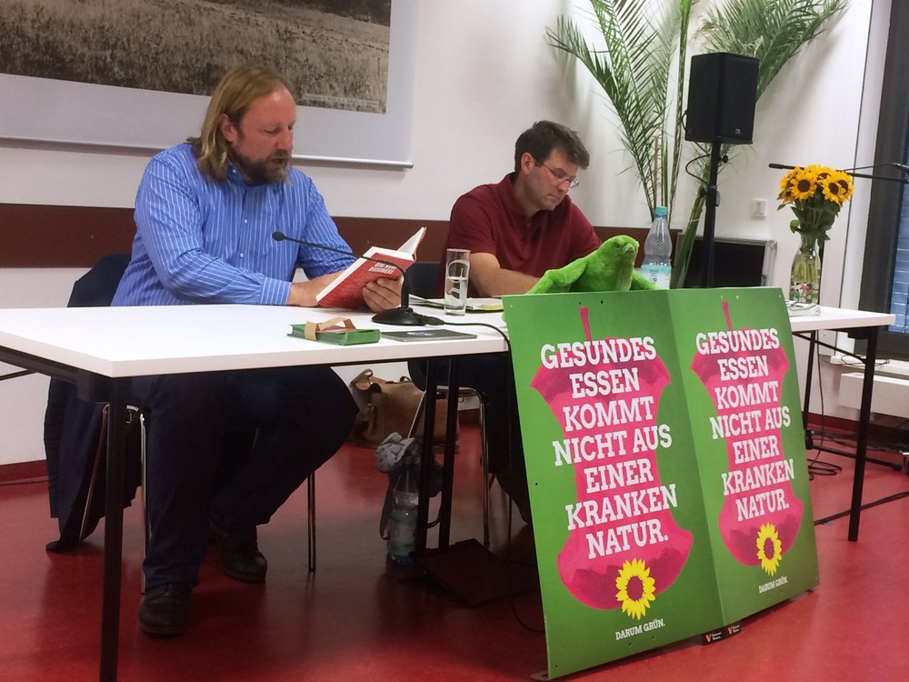 Der Einladung des Kreisverbandes von Bündnis 90/Die Grünen aus Märkisch-Oderland zur Lesung von Anton Hofreiter, Fraktionsvorsitzender der Bündnisgrünen im Bundestag, waren am 02. September mehr als 40 interessierte BesucherInnen gefolgt. Deutlich wurde bei der Lesung aus dem Buch „Fleischfabrik Deutschland“ und der anschließenden Diskussion über die aktuelle Situation in der Landwirtschaft, dass es einen Wandel in der Landwirtschaftspolitik nur mit starken Grünen geben wird. An der Diskussion nahm auch JAN SOMMER, bündnisgrüner Direktkandidat für Märkisch-Oderland und Bio-Bauer, teil.